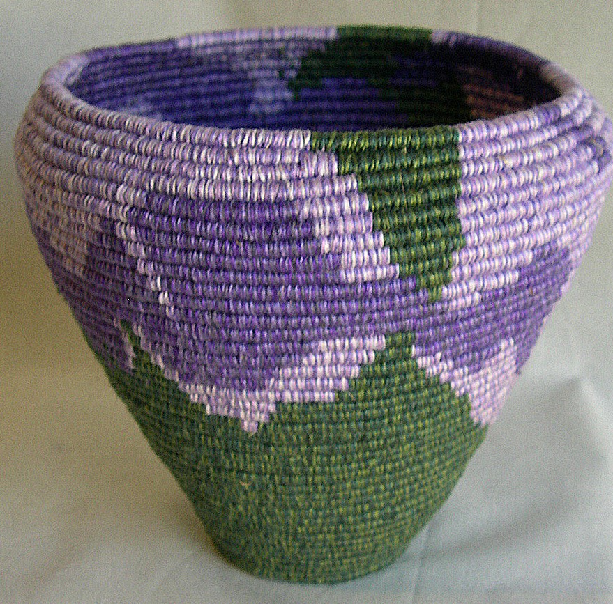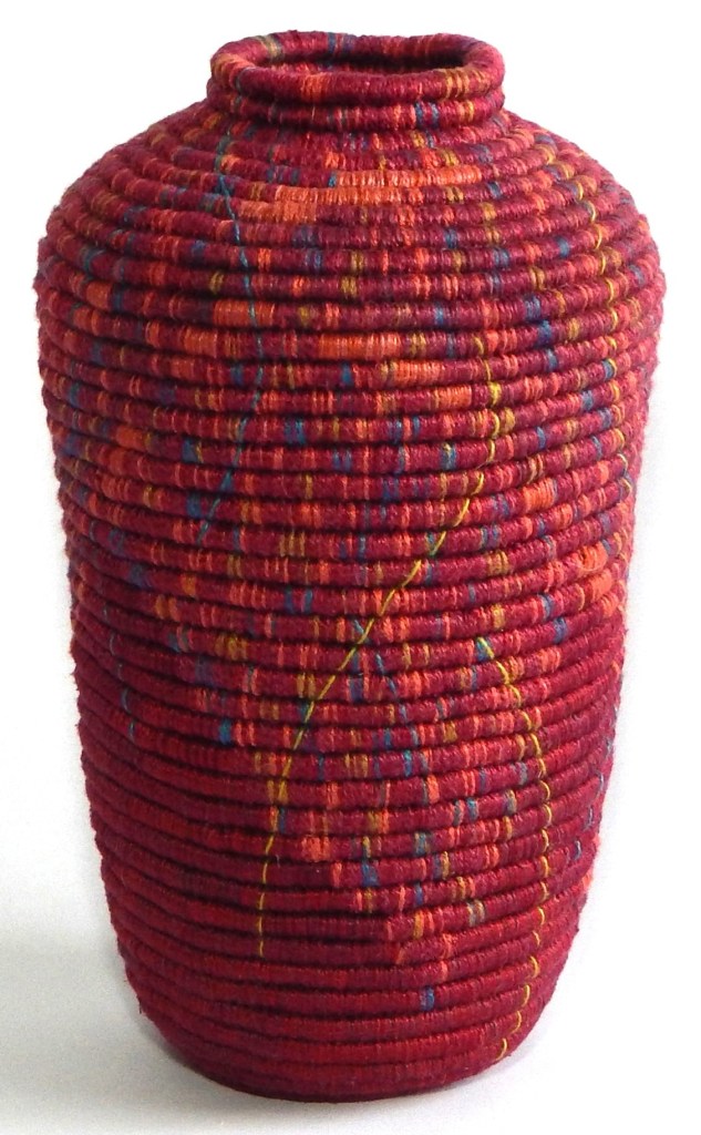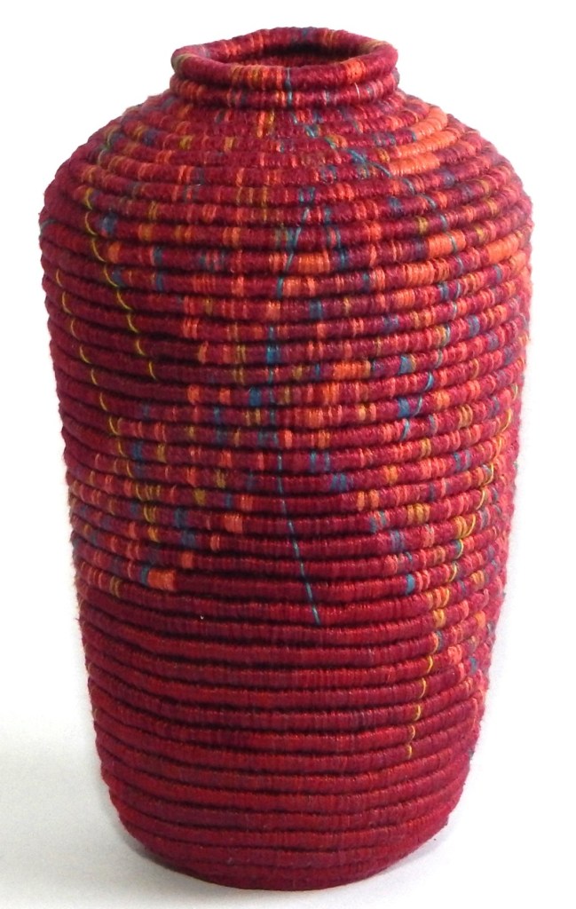 Tributary 2004 12.5″ by 5.5″ Coiled basketry vessel closed coiled using Figure 8 stitch. Cotton, mohair/wool over jute cordage. NFS.